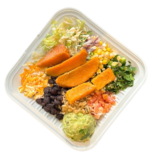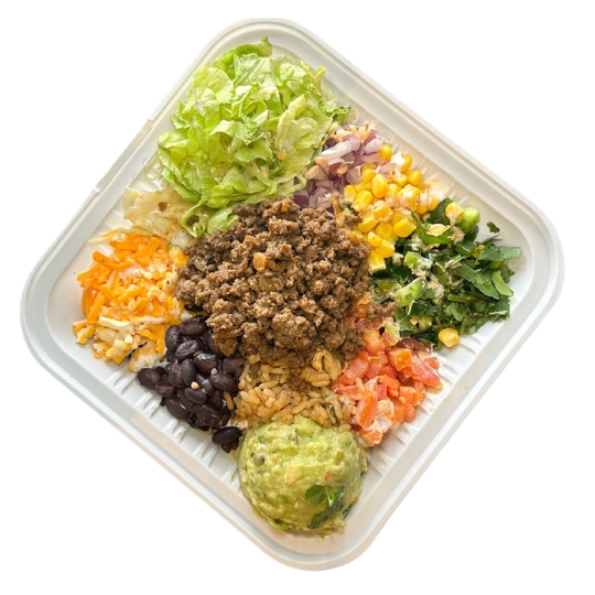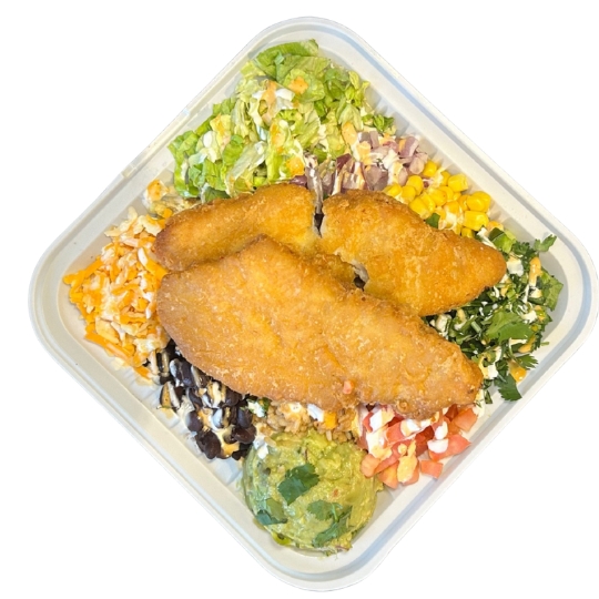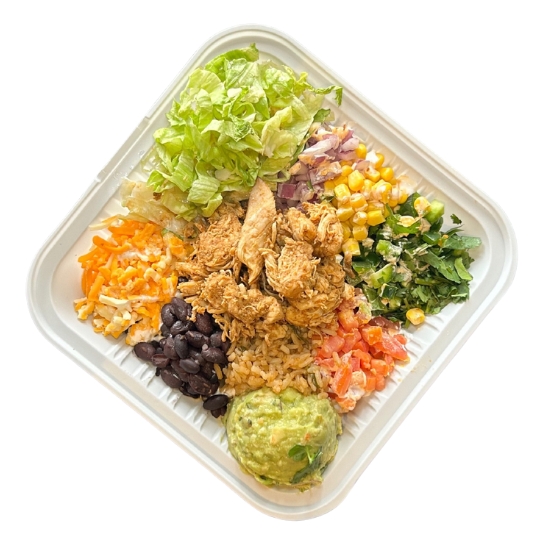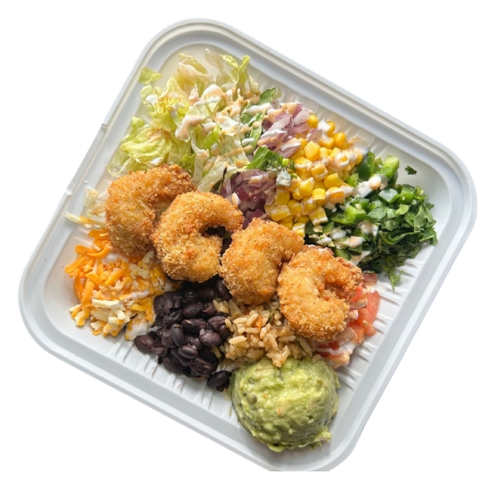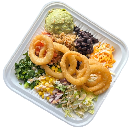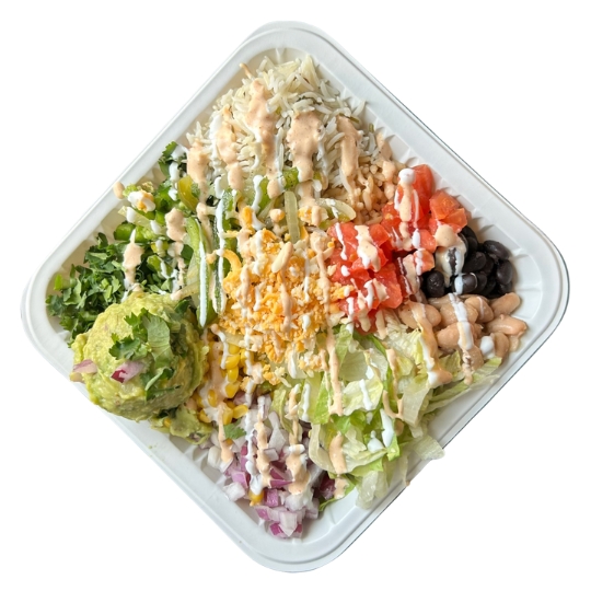 Your choice of our premium Proteins topped with Rice, Beans Tex Mex Cheese, Lettuce Tomatoes, Red Onions, Corn, Cilantro, Fresh Jalapenos, and Fajita Veggies , served with your choice of Sour Cream, Burrito Sauce and Hot sauce.